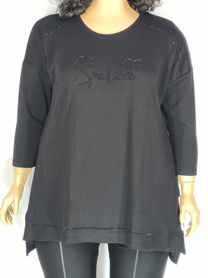 Дамски макси блузон в големи размери от плътно трико с щампа от камъчета в черно 01 01504