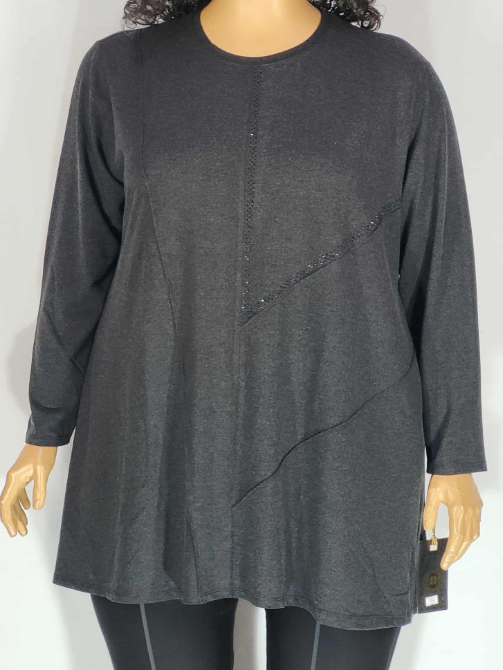 Дамски макси разкроен блузон в големи размери дюс сиво с камъчета от кашмирено трико 01 01511