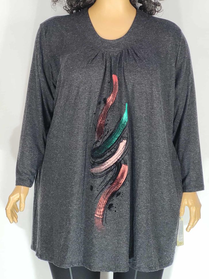 Дамски макси разкроен блузон в супер големи размери с щампа и камъчета от кашмирено трико в сиво 01 01512
