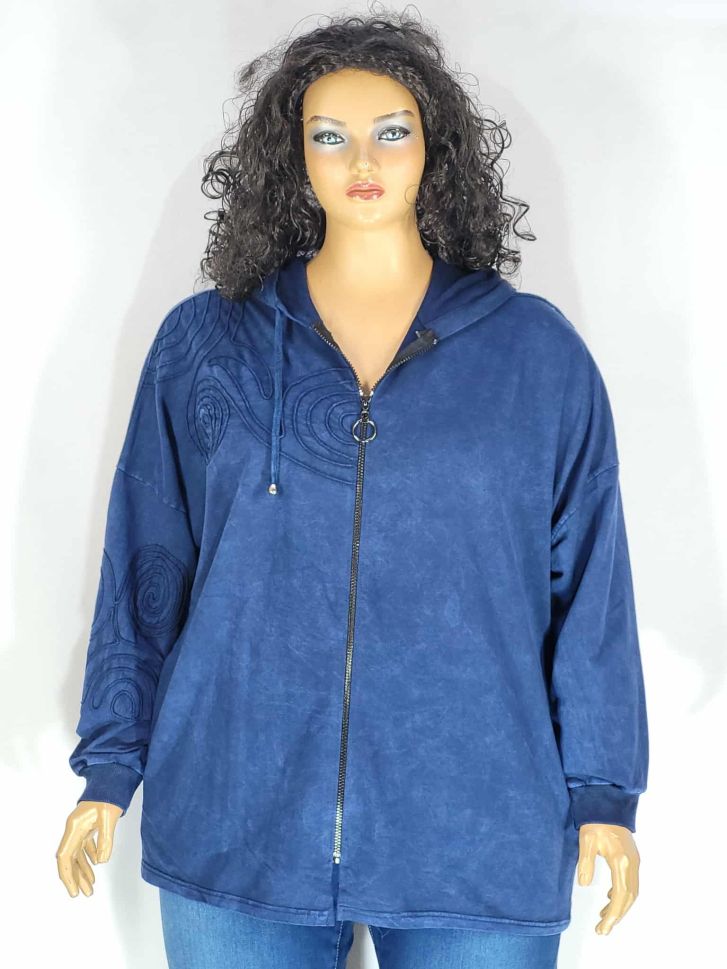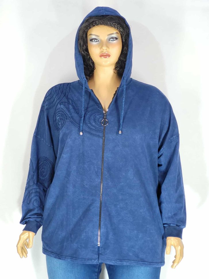 Дамски макси суичър варен памук в големи размери с цип и интересна апликация с машинни шевове в тъмно синьо 08 00059