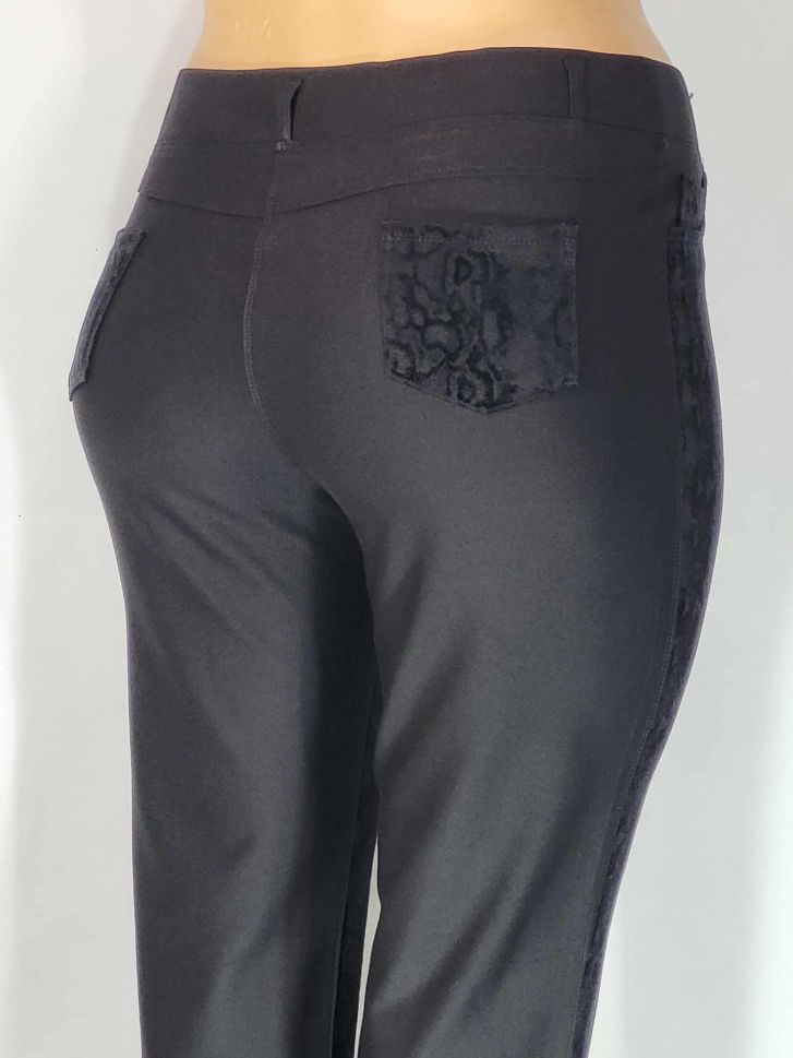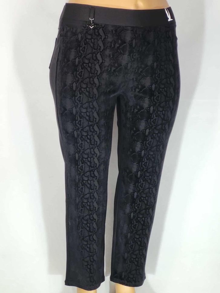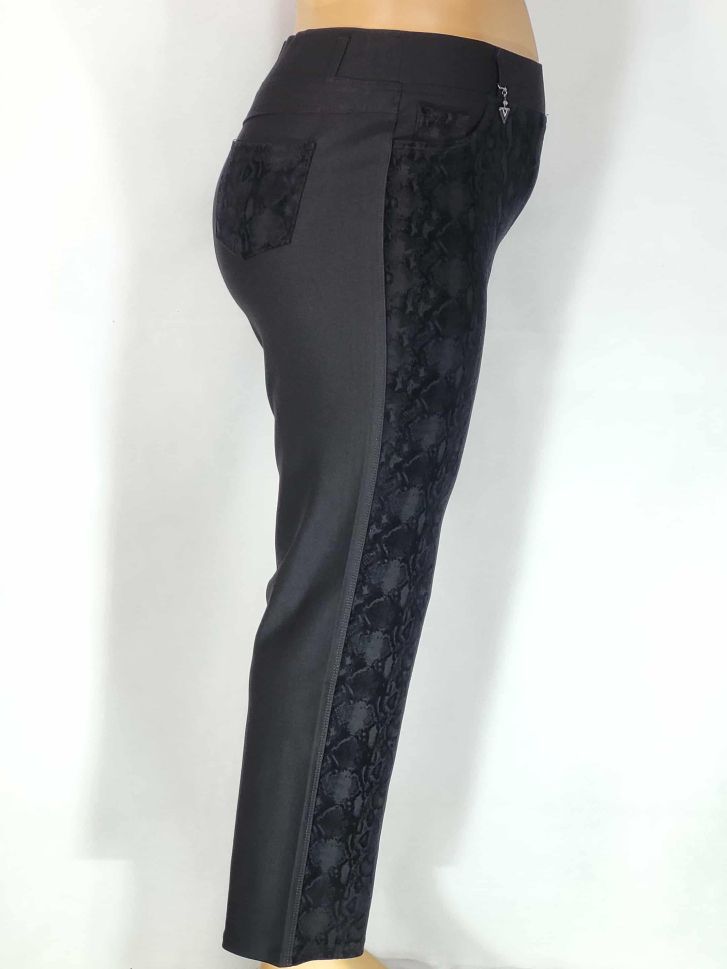 Дамски макси много еластичен плътен панталон в големи размери с интересна щампа в предната част на крачола в черно 03 00550