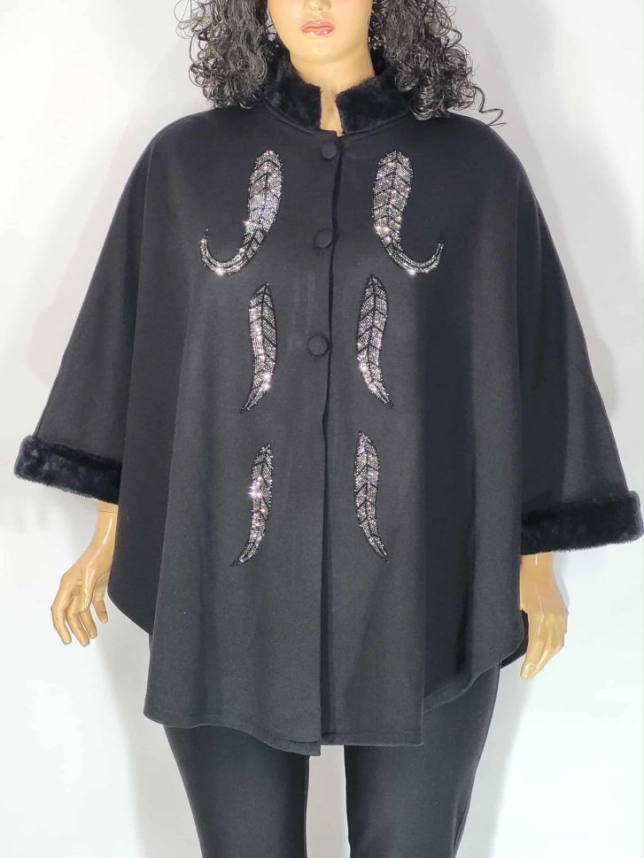 Дамско макси пончо в големи размери от плетена материя еко кожа и апликация камъни 06 00277