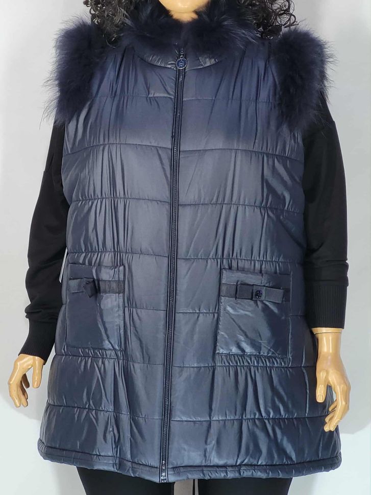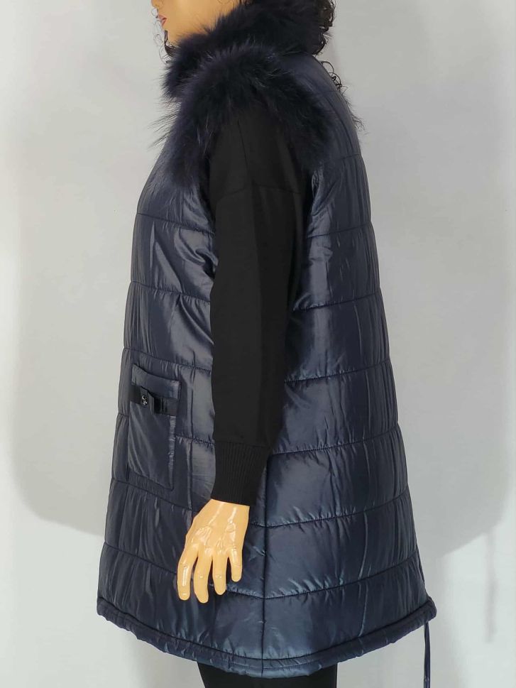 Дамски макси зимен елек в големи размери с ефектни кожи в тъмно синьо 06 00279