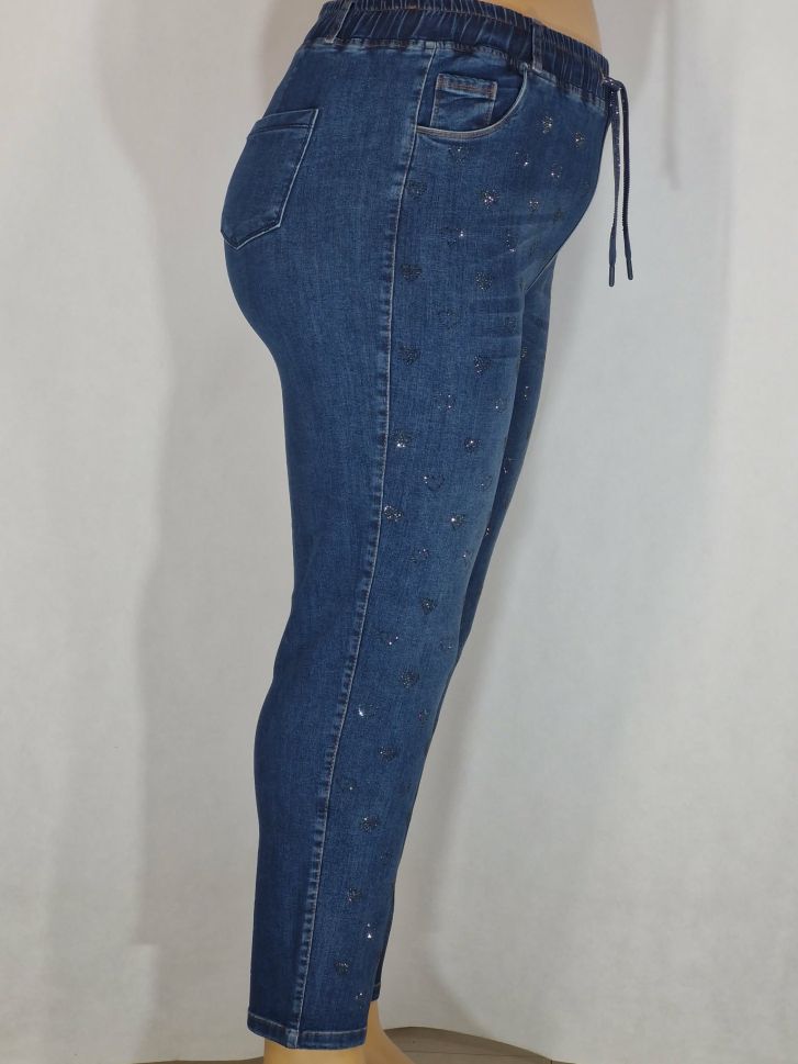 Дамски макси дънки в големи размери с щампа камъчета сърца в класическо синьо с връзки 02 00563