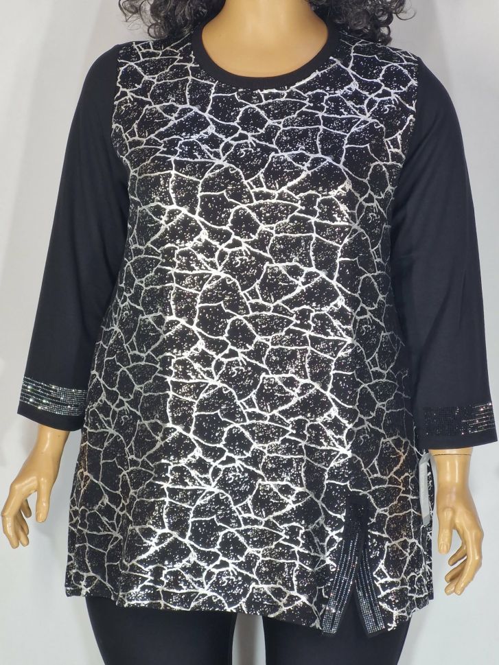 Дамски макси блузон в големи размери от плътно трико с интересна щампа и камъчета в черно 01 01548