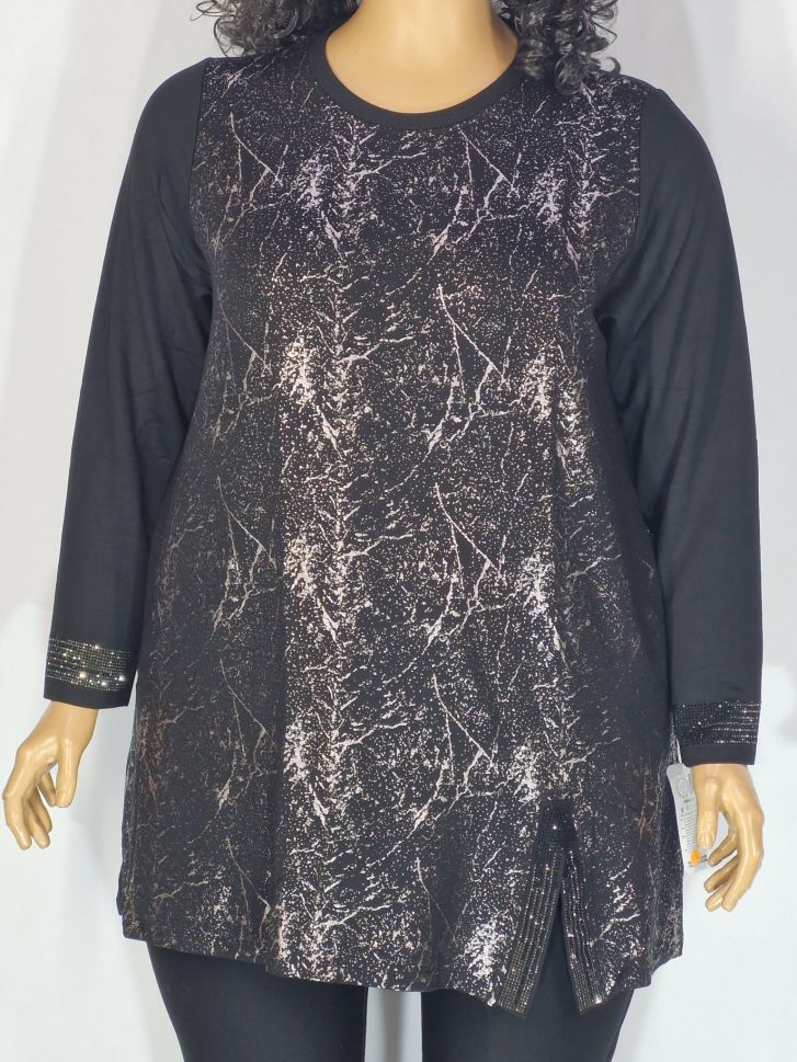 Дамски макси блузон в големи размери от плътно трико с интересна щампа и камъчета в черно 01 01549