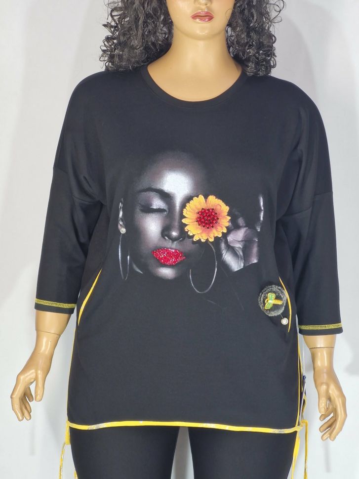 Дамска макси блуза в големи размери от плътно трико с щампа и камъчета в черно 01 01552