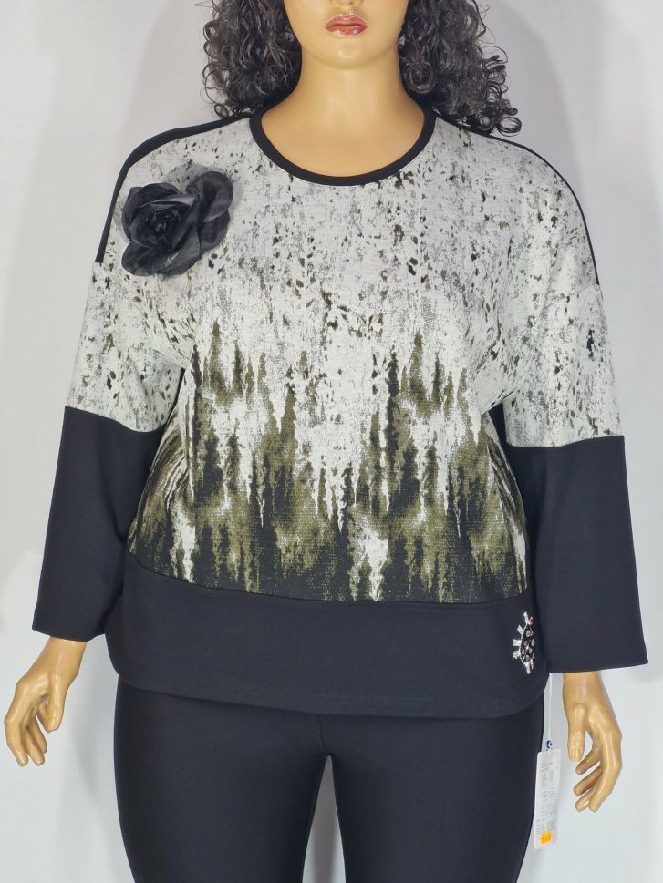 Дамска макси блуза в големи размери от плътно трико с абстрактен принт и декоративно цвете 01 01555