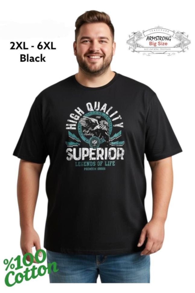 Мъжка тениска в големи размери от 2XL до 6XL, изработена от 100% памук. Удобен модел с класическа кройка, кръгло деколте и стилна щампа. Подходяща за ежедневно носене, спорт и свободно време. Идеален избор за мъже с едро телосложение, търсещи качествена памучна тениска в голям размер.