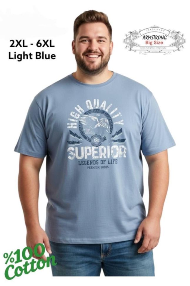 Мъжка тениска в големи размери от 2XL до 6XL, изработена от 100% памук. Удобен модел с класическа кройка, кръгло деколте и стилна щампа. Подходяща за ежедневно носене, спорт и свободно време. Идеален избор за мъже с едро телосложение, търсещи качествена памучна тениска в голям размер.
