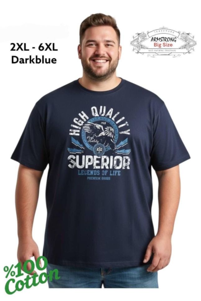Мъжка тениска в големи размери от 2XL до 6XL, изработена от 100% памук. Удобен модел с класическа кройка, кръгло деколте и стилна щампа. Подходяща за ежедневно носене, спорт и свободно време. Идеален избор за мъже с едро телосложение, търсещи качествена памучна тениска в голям размер.