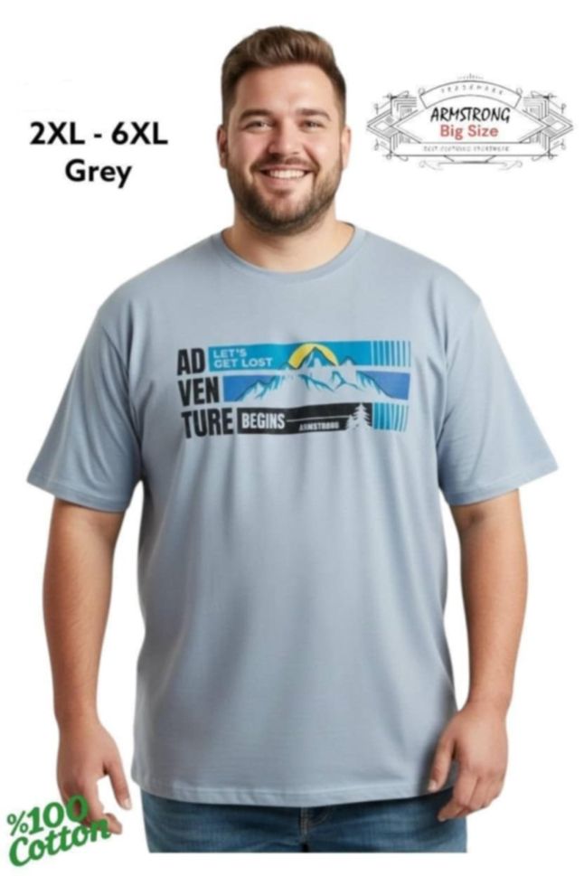 Мъжка тениска в големи размери от 2XL до 6XL, изработена от 100% памук. Удобен модел с класическа кройка, кръгло деколте и стилна щампа. Подходяща за ежедневно носене, спорт и свободно време. Идеален избор за мъже с едро телосложение, търсещи качествена памучна тениска в голям размер.