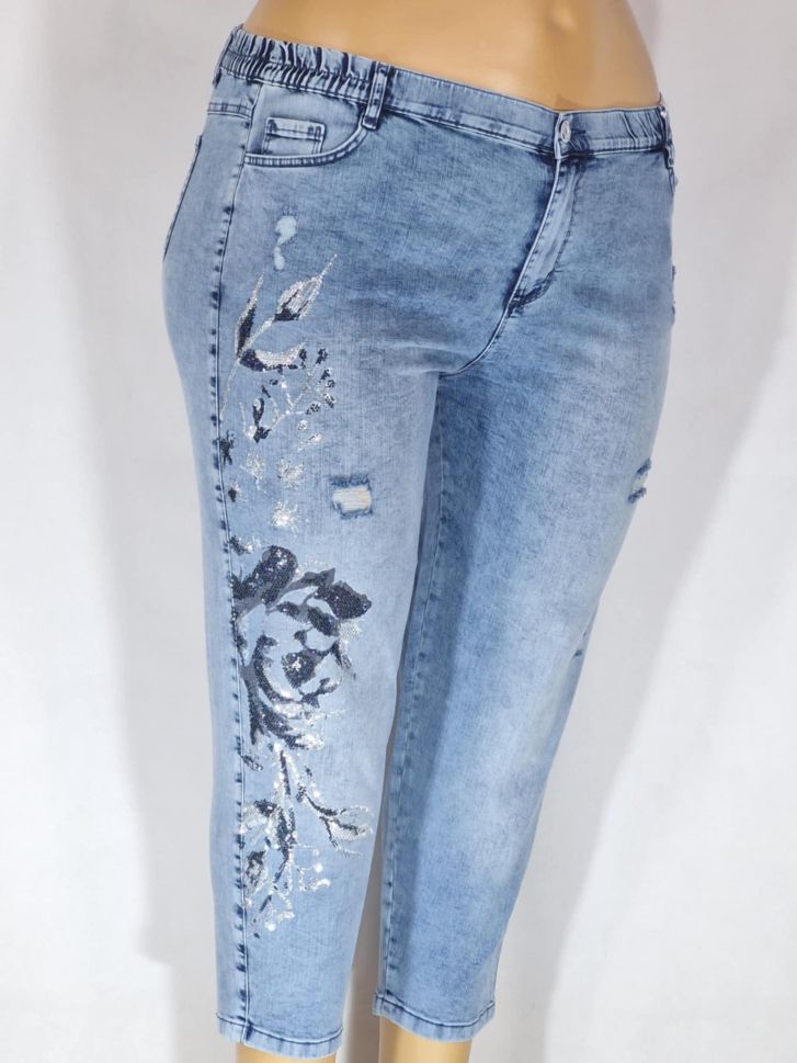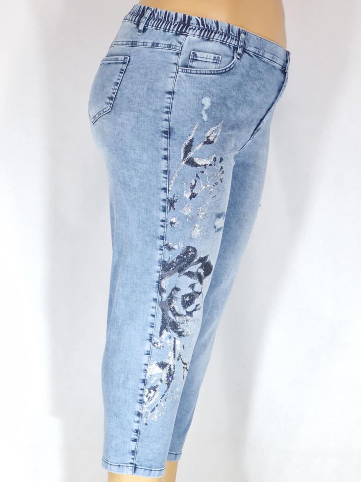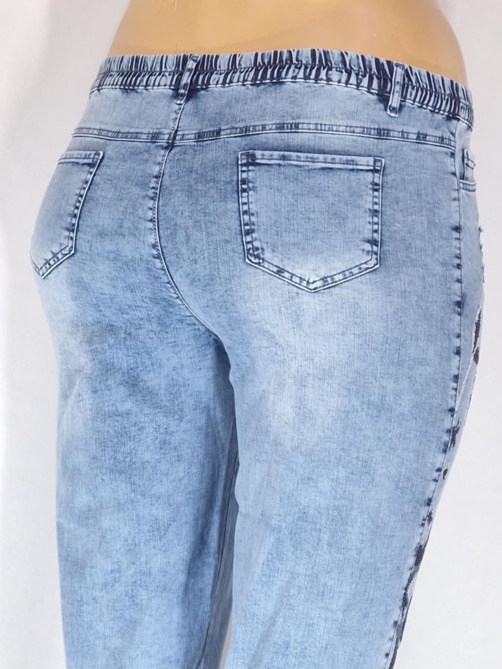 Дамски макси дънки в големи размери с интересна щампа цветя и камъни с кръпки в синьо 02 00574