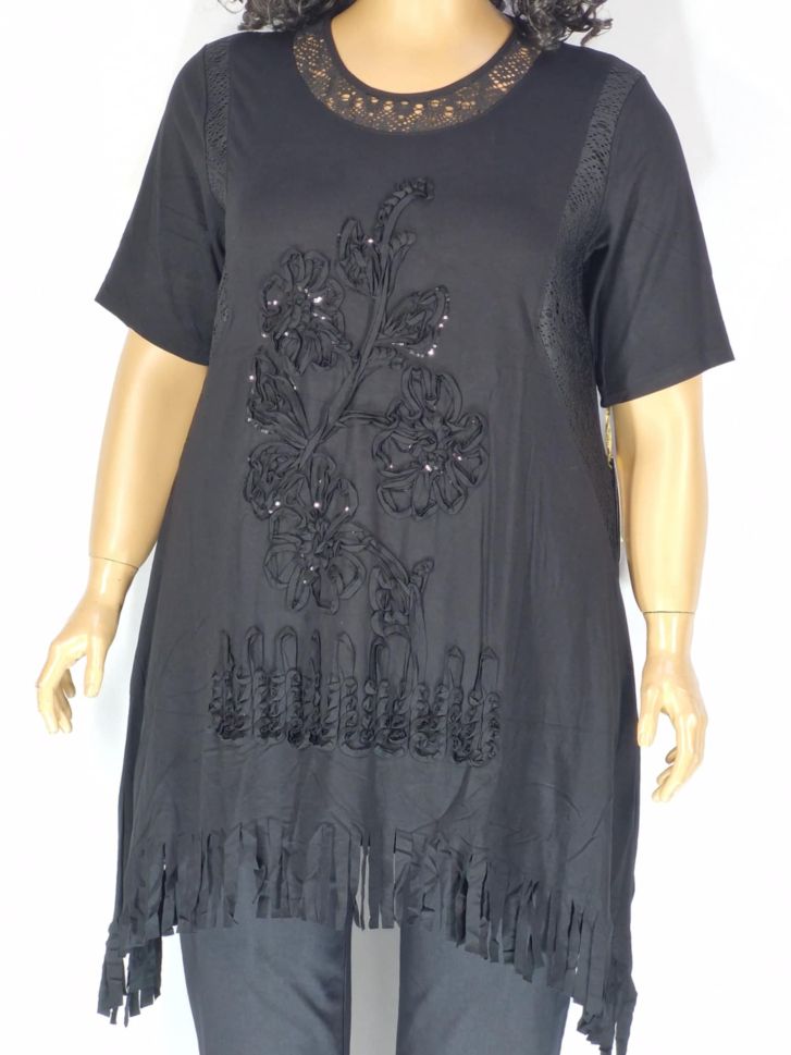 Дамски макси блузон с къс ръкав в големи размери с интересна апликация ресни и камъчета в черно 10 00115