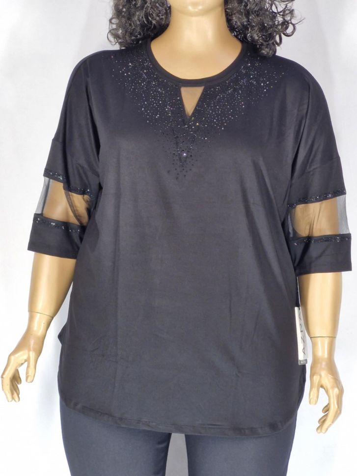 Дамска макси блуза в големи размери от трико с 3/4 ръкав,тюл и щампа от камъчета в черно 10 00119