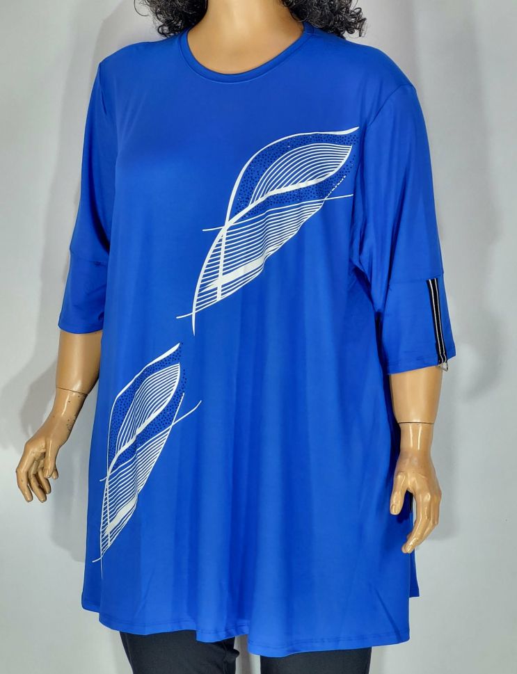 Дамски макси разкроен блузон в супер големи размери с щампа в синьо 10 00127