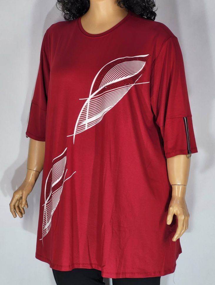 Дамски макси разкроен блузон в супер големи размери с щампа във винено 10 00128