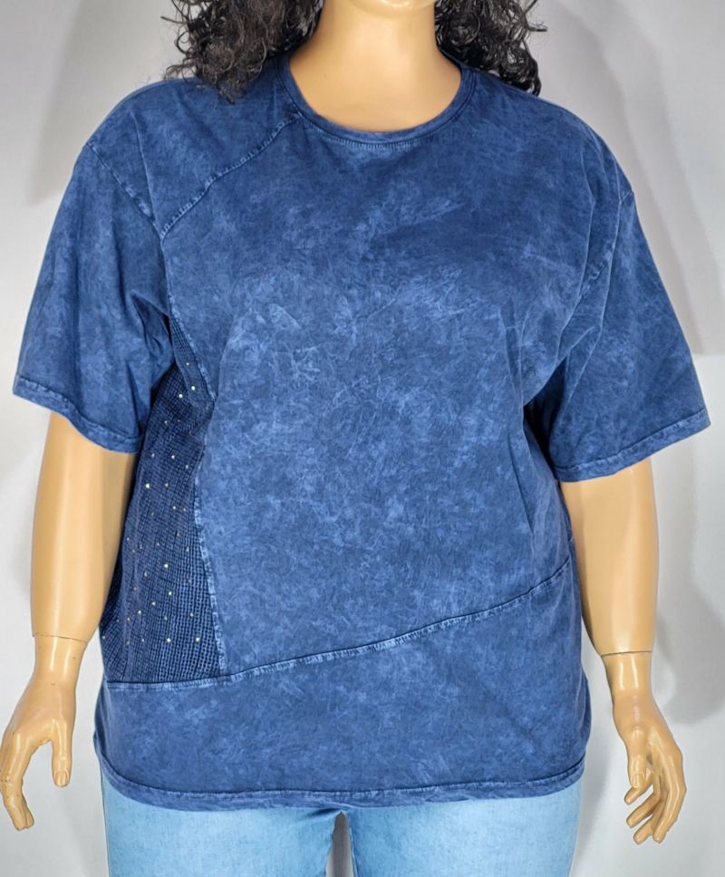 Дамска макси блуза варен памук с къс ръкав в големи размери изчистена с мрежа в синьо 10 00132