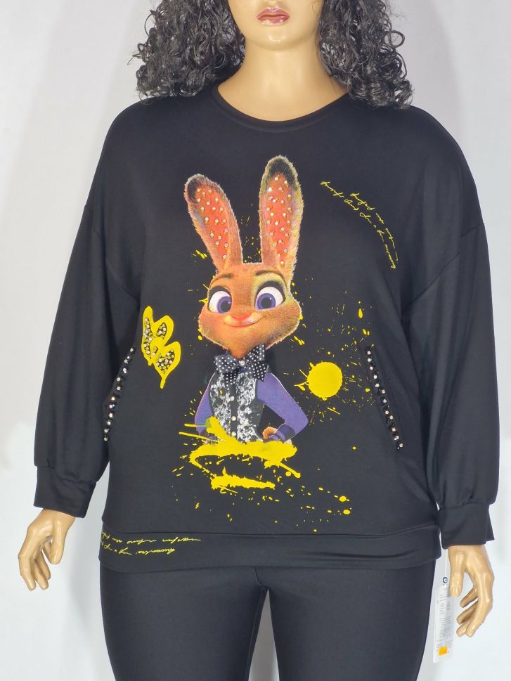Дамска макси блуза в големи размери от плътно трико с интересна щампа заек и камъчета в черно 01 01557
