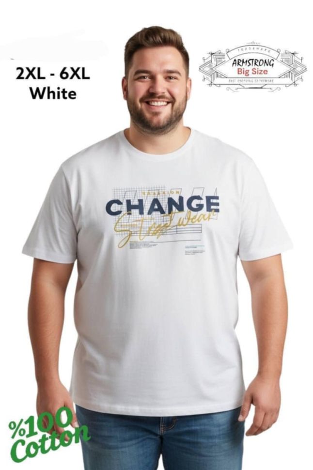 Мъжка тениска в големи размери от 2XL до 6XL, изработена от 100% памук. Удобен модел с класическа кройка, кръгло деколте и стилна щампа. Подходяща за ежедневно носене, спорт и свободно време. Идеален избор за мъже с едро телосложение, търсещи качествена памучна тениска в голям размер.